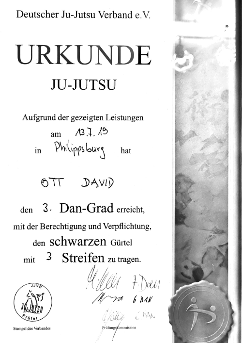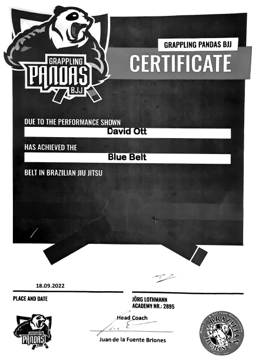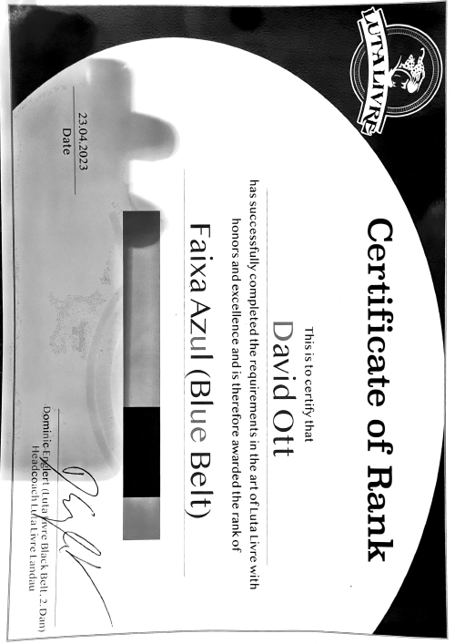 Angefangen habe ich mit Ju-jutsu, eine Mischung aus allen großen japanischen Kampfsportarten. Mittlerweile habe ich den 3. DAN (Schwarz mit 3 Streifen) im Ju-jutsu. Seit ca. 5 Jahren trainiere ich hauptsächlich Luta livre und Bjj und habe in beiden Sportarten den Blauen Gürtel.