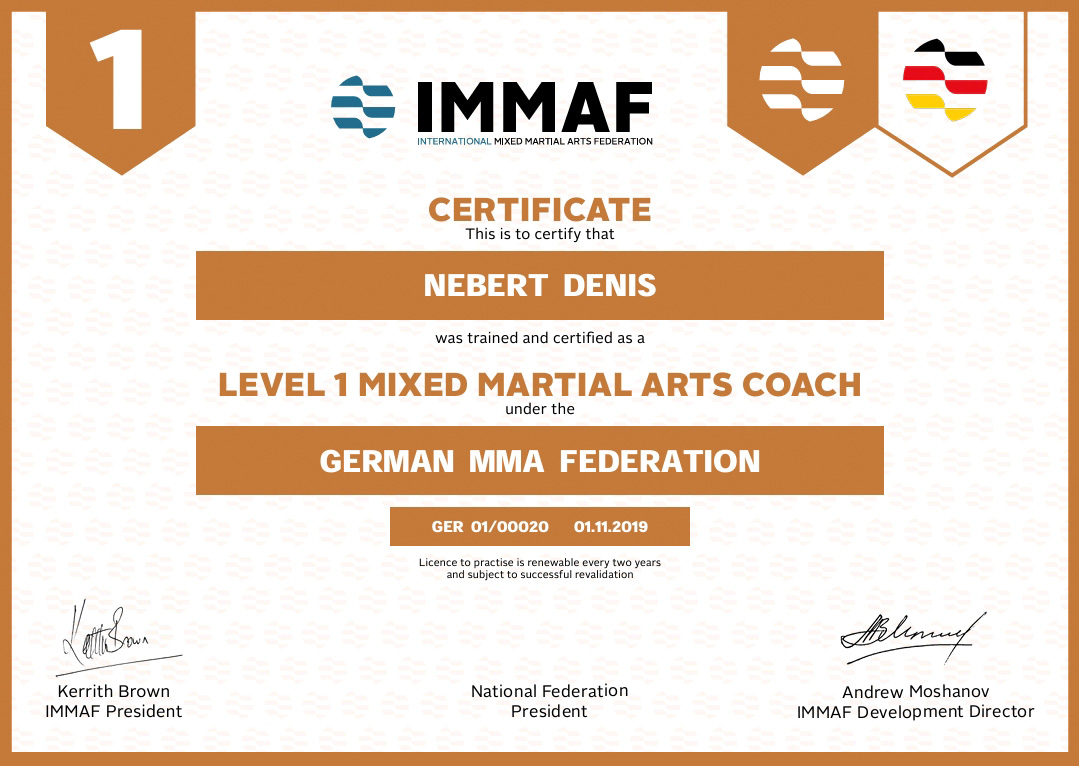 2019 ließ ich mich als Level 1 Mixed Martial Arts Coach bei der IMMAF ausbilden. KSN ist Mitglied der German Mixed Martial Arts Föderation (GEMMAF).